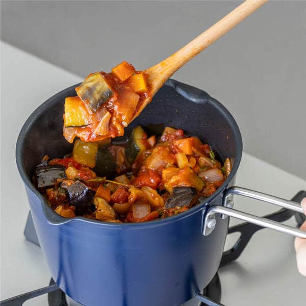 特徴的な細長さと丸みのある柄に加え、幅・深さ・長さがコンパクトに設計されたすくう部分。この絶妙なバランスに、ぬくもりのある木の質感が手にしっくりと馴染みます。軽くて動作に負担がなく、握り疲れないのもうれしいところ。柄が長いため、加熱調理中でもコンロの熱を感じにくく、快適に調理を進められるのが魅力です。油跳ねも気にならず、安全に使える点も安心。さらに、柄の長さを活かして、深さのある鍋とも相性抜群で、幅広く活躍します。