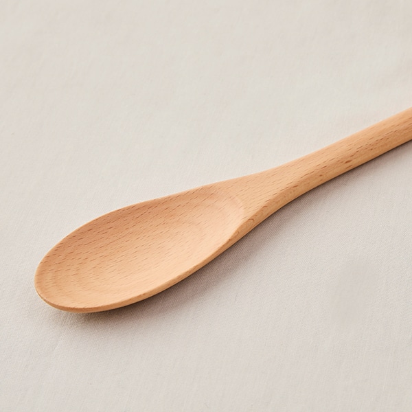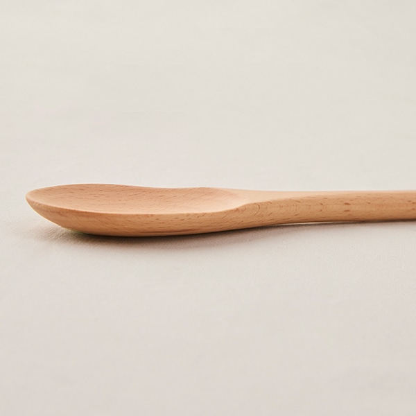 「調理用スプーン(小)」は、一般的なスプーンよりもすくう部分が浅く、やや細身の幅が特徴で、鍋肌やフライパンの側面に沿いやすいデザインです。菜箸のように小回りを利かせながら、木べらのように食材をまとめて炒めたり、かき混ぜるのも得意です。完全に平らではないため、すくう部分で料理や食材をしっかり受け止められるのも魅力。軽くさらったり、すくったりといった使い方もでき、炒め物から煮込み料理まで幅広く活躍する頼れる一本です。