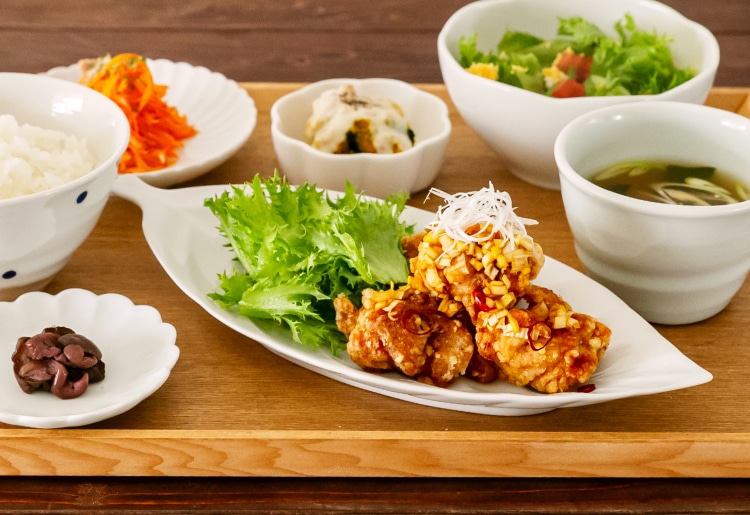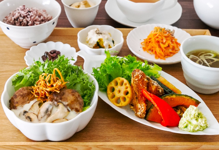 えらべるメイン1品に、副菜3品、ごはん(白米または雑穀米)、みそ汁、香物のセットです。