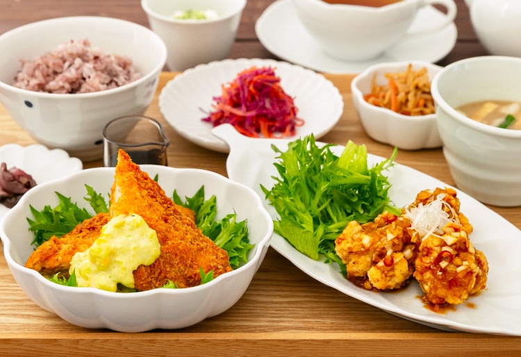 メインのおかずからお好きな2品に、副菜2品、ごはん(白米または雑穀米)、みそ汁、香物、ミニデザート1品、ドリンクのセットです。