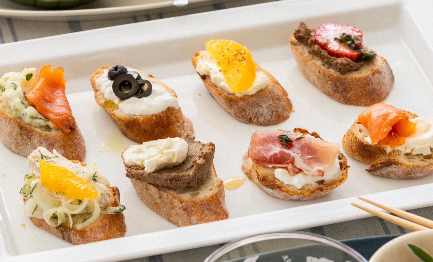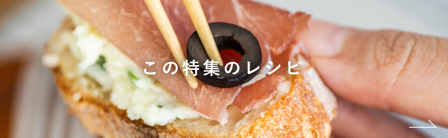 ペーストやマリネ、ハムやチーズ、スモークサーモン、オリーブ、フルーツなど。さまざまな具材を組み合わせてバゲットにのせたオープンサンドは、直接手でつかんでいただける手軽さが魅力です。