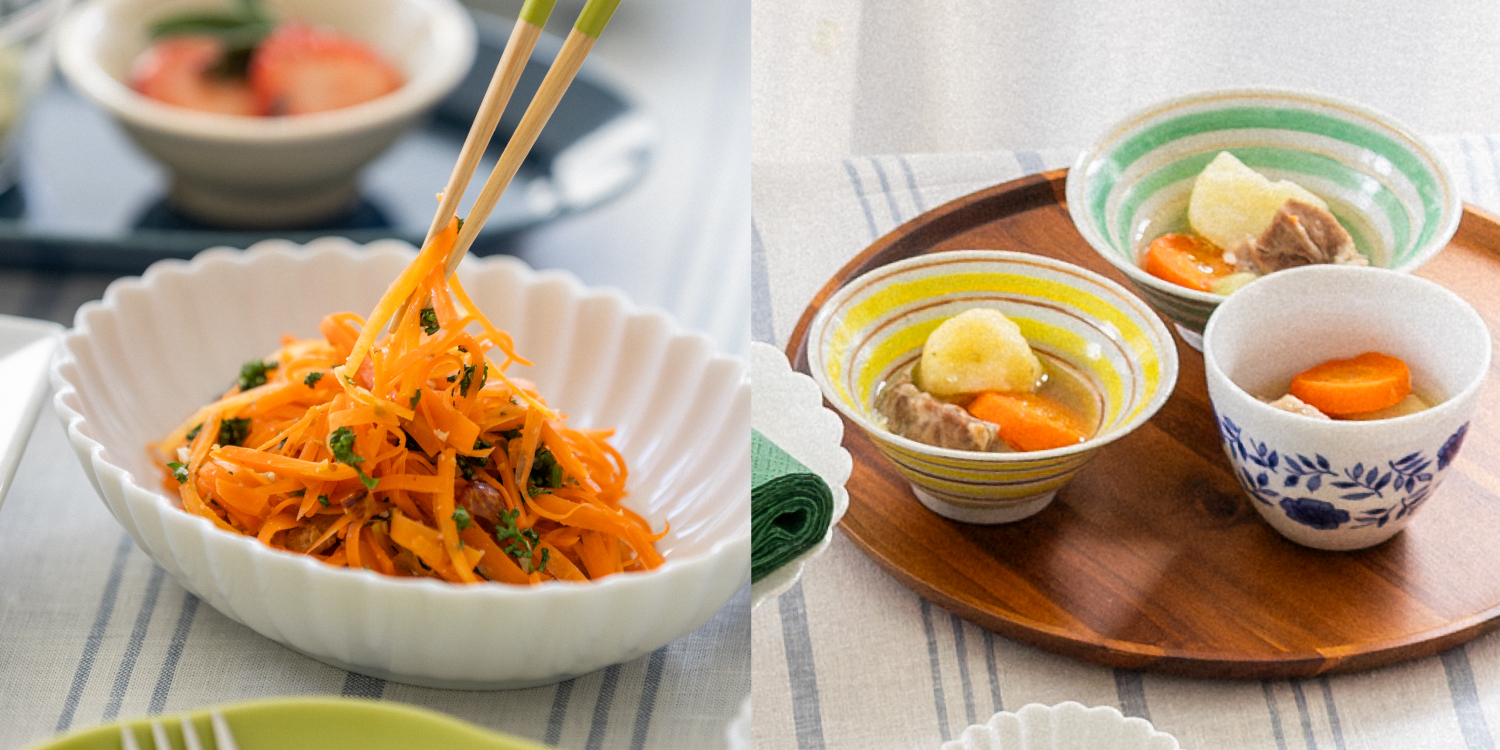箸休めにはさっぱりとしたラペなどがおすすめです。取り分ける料理には、それに合わせた箸やスプーンなどを添えて、スムーズに取り分けられるよう心がけましょう。