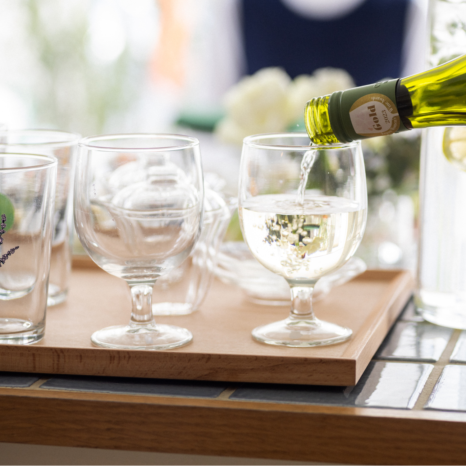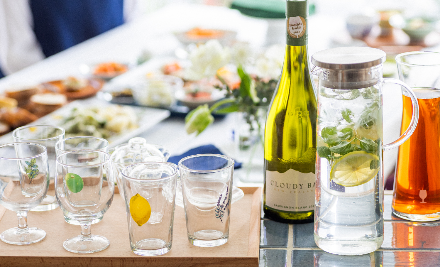 お酒を嗜む集まりなら、キリッと冷えた白ワインを。傍らには、ポットやカラフェに入れたハーブウォーター、紅茶なども用意しておきましょう。