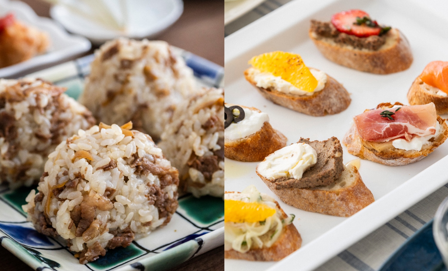 ゆとりの空間が、春のあつまりごはんにおすすめする「おにぎりビュッフェ」と「オープンサンドビュッフェ」。どちらも手軽につまめるのがうれしい、暮らしに身近な料理です。