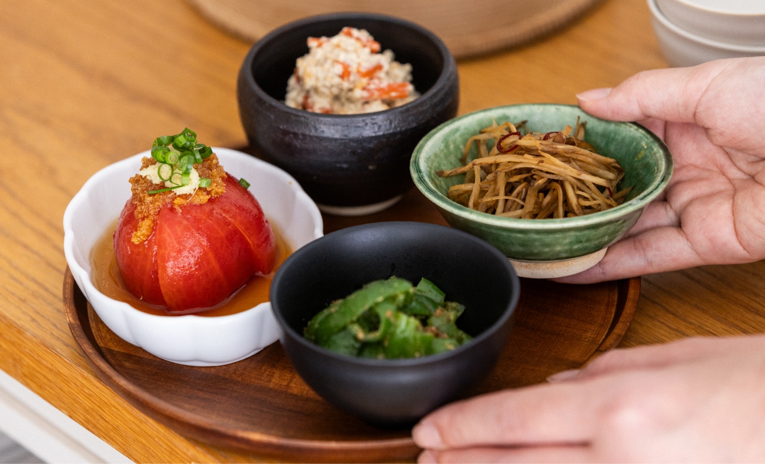 その他にも、小鉢に盛りつけた数種類のおかずを用意して、器ごと自由に選んでもらいましょう。気分に合わせてゲストがお気に入りの小鉢を見つける楽しさも、ビュッフェならではの醍醐味です。