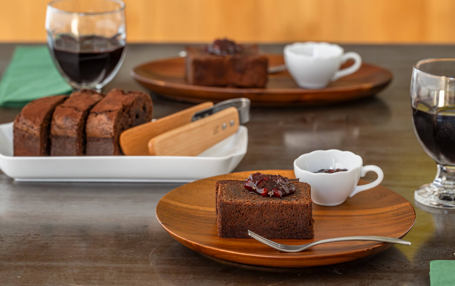しっとり濃厚なチョコレートケーキには、甘酸っぱいラズベリージャムが、味も色もおもてなしの時間にアクセントを添えます。