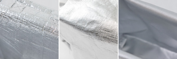 巾着型のマルシェバッグやおべんとうグッズには、軽量な薄手のアルミシートを採用。軽く、持ち運びやすく、毎日のお買い物や通勤・通学にもぴったりです。ベルクロ仕様のトートバッグには、軽さと安定感を両立した、ほどよい厚みのアルミ素材を使用しています。スクエア型のバッグとペットボトルホルダーは、厚みのあるアルミ素材で、重たい荷物をしっかりと支える、安定感のある使い心地です。
