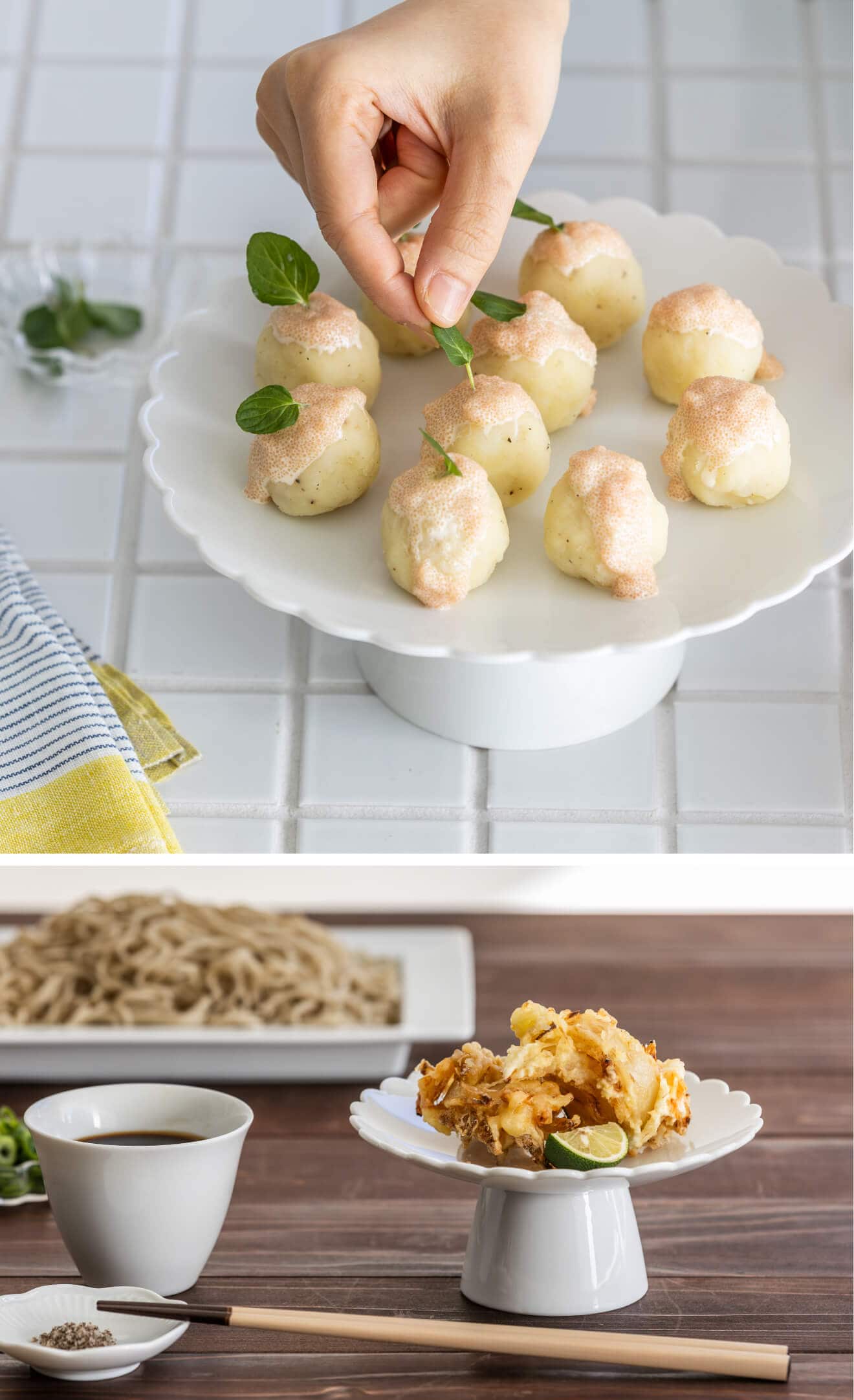 そんな春の盛りつけは、花のかたちの器選びがおすすめ。食卓に花が咲いたように明るく楽しく、うれしい気持ちになります。オーソドックスなものから、1枚あるだけでそこに存在感が出る個性的なものまで、さまざまな花のかたち。種類が異なる器でも、色を白で揃えれば、食卓に統一感が出せるから、組み合わせは無限です。