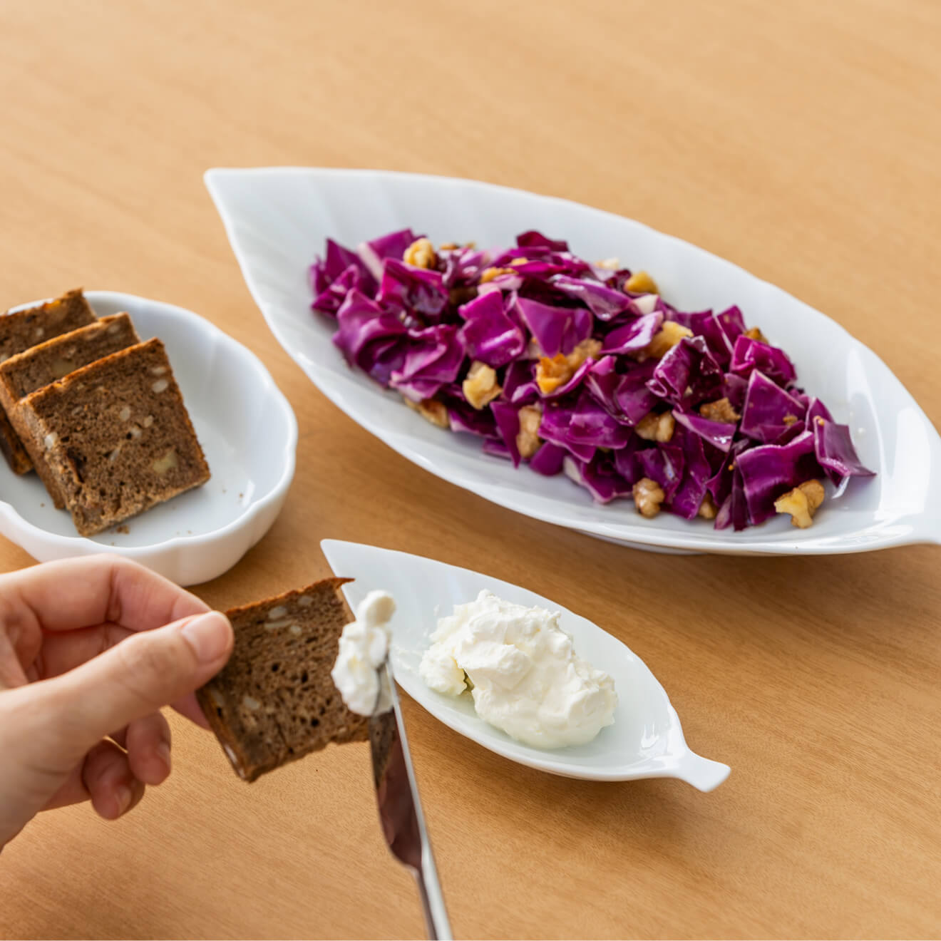 大胆な盛りつけが叶う大皿、輪花バリエーショントレー。大きな長角皿は珍しいですが、レタスなど大ぶりな野菜をざっくりと、思い切って盛りつけてみましょう。意外と気軽で、おもてなしの食卓で主役として活躍してくれます。スマートな印象の長角皿も、フレームに花びらの形がデザインされているだけで、料理とのバランスがとりやすくやさしい印象に。食パンちょうどのサイズ感のトーストトレーは、シンプルにトーストをのせるだけでもかわいいですが、アレンジトーストや、デザートの盛りつけなど、ひと工夫してみると、見え方が華やぎます。