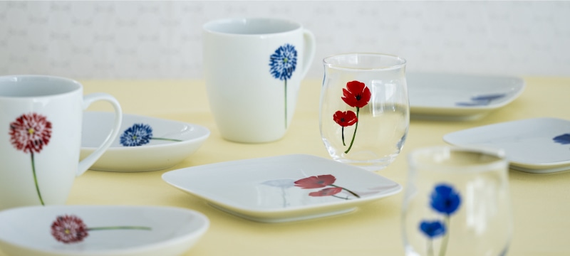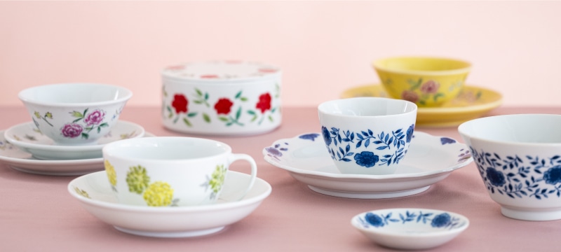 ワンポイントのアクセントが愛らしい器や、花模様がちりばめられた一枚、花びらのかたどりが楽しい小皿など、食卓に華やぎを添える「花の器」を集めました。
