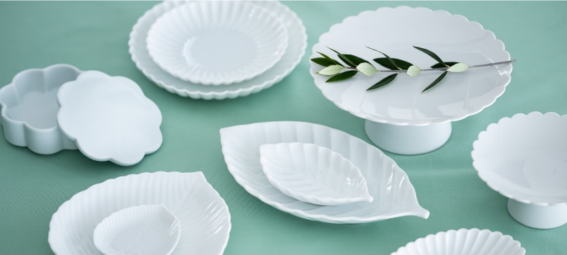 同じ白い器でも、花びらを模した「輪花(りんか)」に変えるだけで、立体感が生まれ、食卓にリズムが出てきます。柔らかな曲線の縁取りは、ふだん使いからおもてなしまで幅広く、一枚あると重宝するもの。葉っぱの形をした器は、食卓に清涼感をもたらしてくれます。