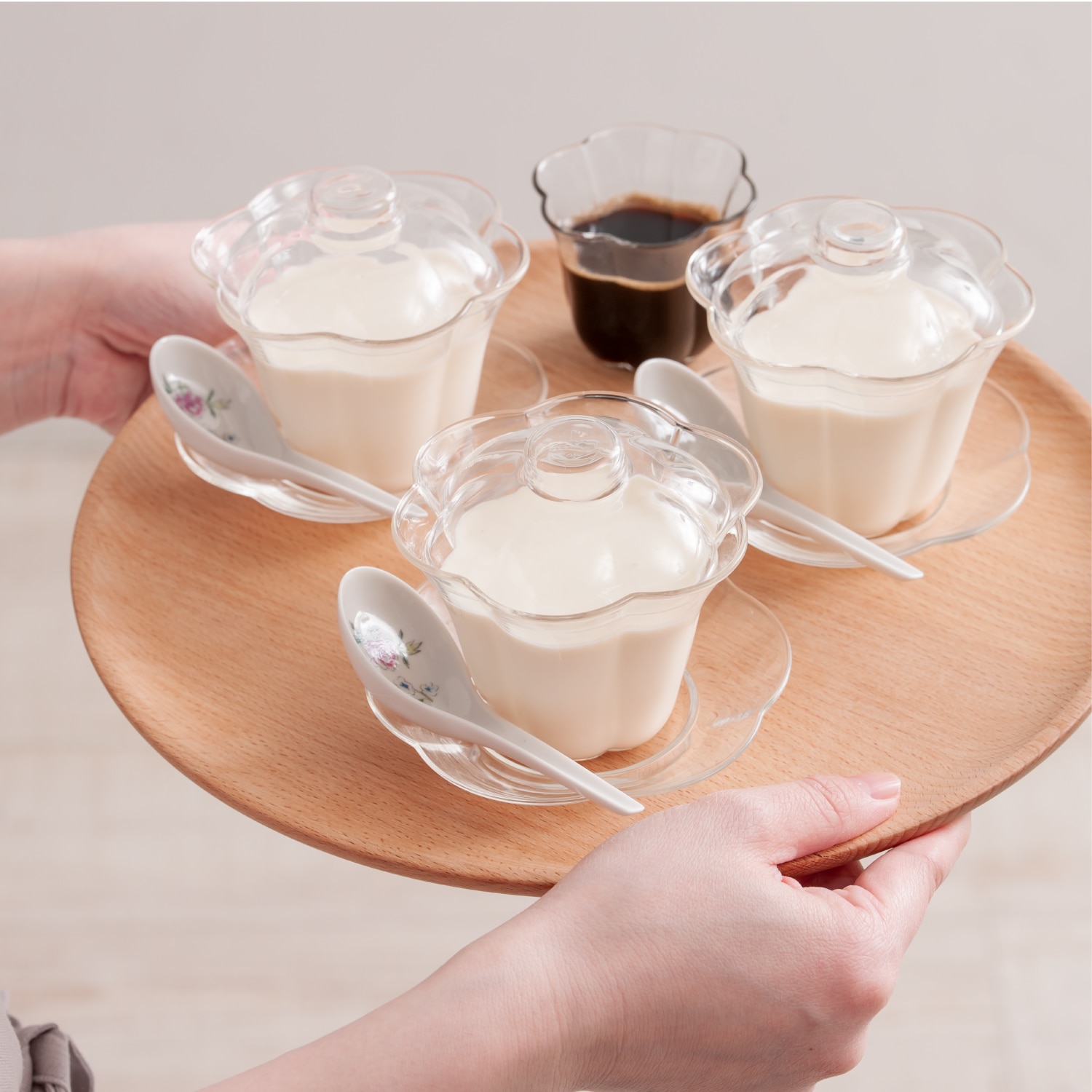 耐熱ガラスのフリーカップは、電子レンジやオーブンにも使える便利な器。透明だから、プリンの焼き上がりがひと目でわかり、焼き時間も見ながら調整できます。アルミ製の容器を使うより華やかで、食卓にそのまま並べても絵になります。