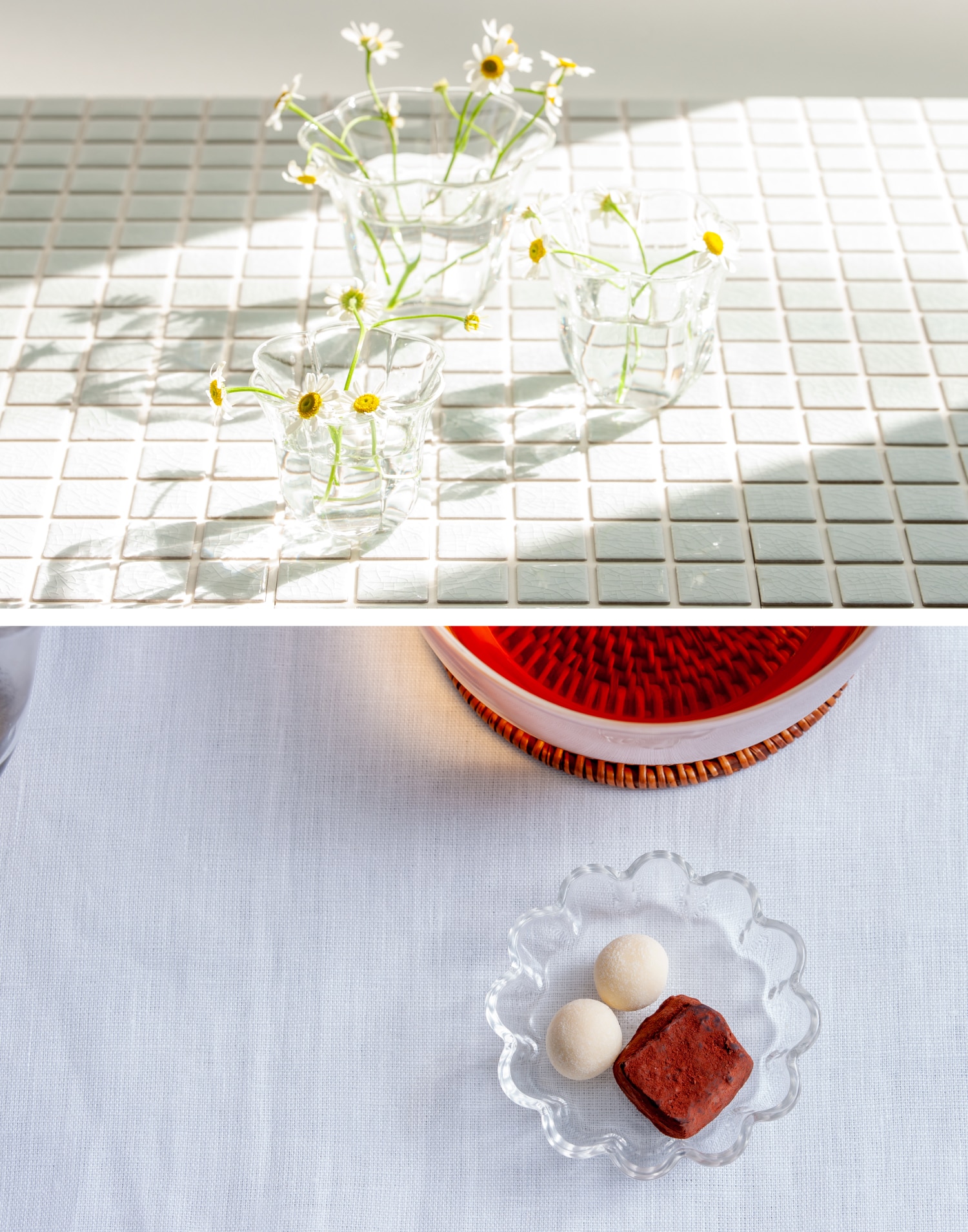 食卓に華を添えるやわらかな輪花のボウルは、置いてあるだけで絵になる繊細で上品な佇まい。日に照らされてきらりと光るガラスの輝きは、にんじんとオレンジのマリネをよりみずみずしく、おいしくみせます。