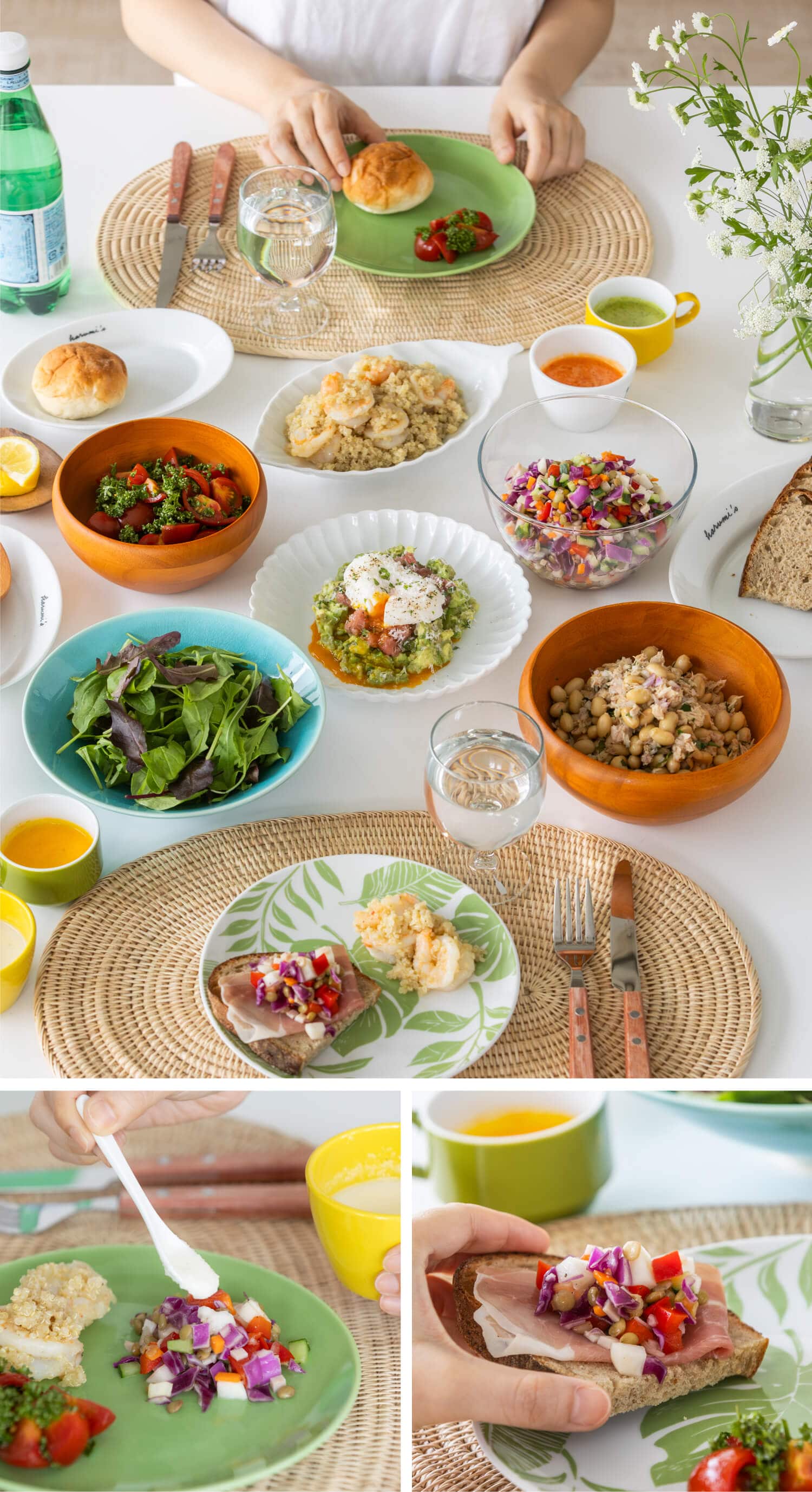 細かく刻まれた野菜や、豆を使ったサラダは、食べたときにいろいろな味や食感が楽しめるのはもちろん、見た目のにぎやかさにも、わくわくして、元気をたっぷりもらえます。