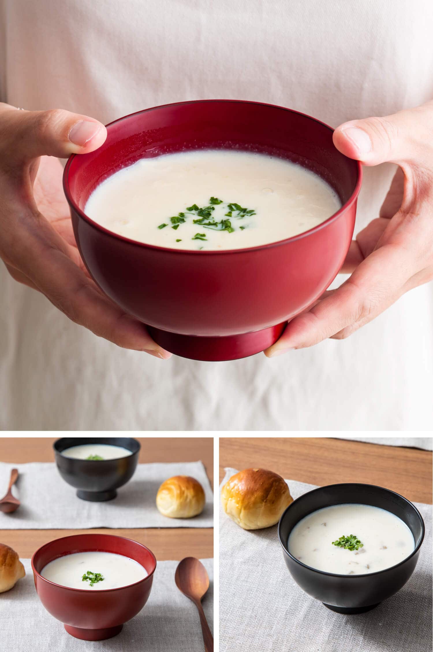 和食のイメージが強い漆塗りの汁椀ですが、洋風のスープも似合います。漆塗りの器に盛りつけると、どことなく落ち着いた雰囲気に。特別なときだけとしまい込まず、漆を気負わずに使ってみませんか。