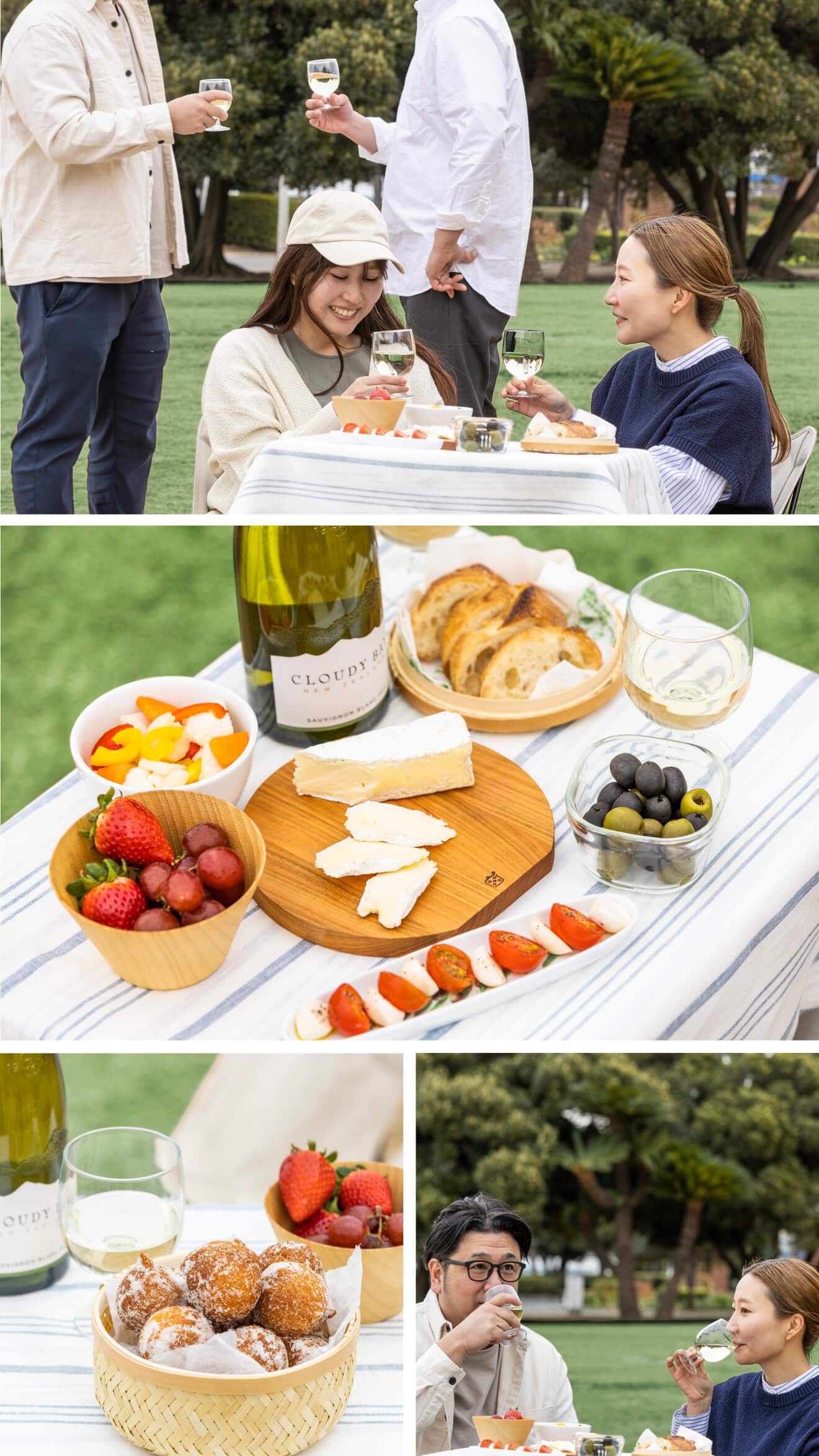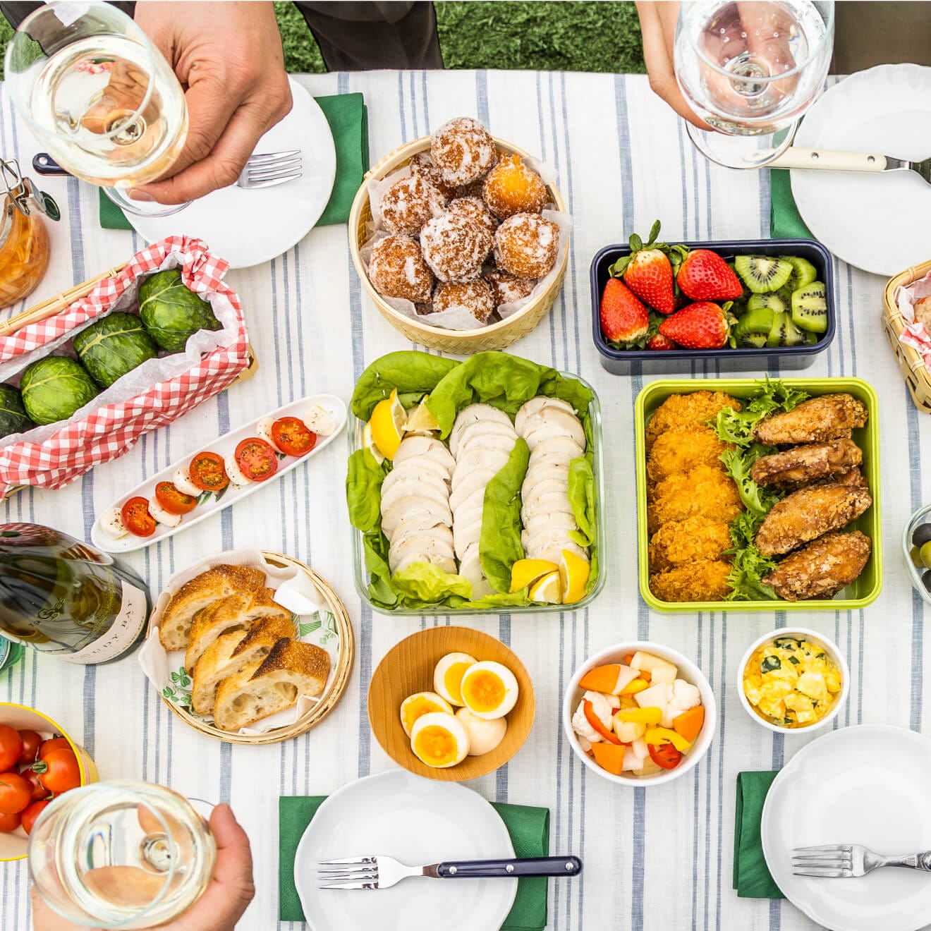 食材を切ったり、ちょっとした作業はその場でもできます。カッティングボードでミニトマトとチーズを切ったらカプレーゼのできあがり。車移動で持ち運びに余裕があれば、カトラリーはいつも使っているものを持ち込むのもおすすめ。リネンのクロスを敷いてバスケットに入れておけば、それだけでワクワク気分が盛り上がります。