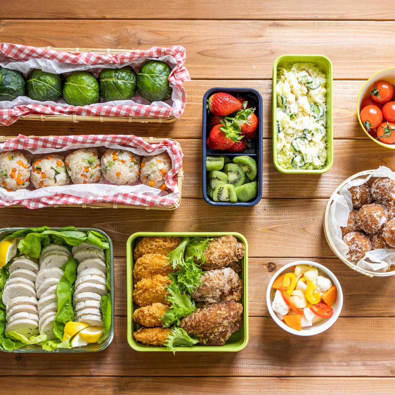 おべんとうは、当日全てを作るのではなく、下準備をしておくと、当日の支度が少し楽になって、盛りつけなど他のことに気が配れます。人数が多いピクニックのようなレジャーシーンでは、作る量も増えるから、時間のあるときに下準備をしましょう。野菜のカットをしておくだけでも、当日が気楽で調理の段取りもスムーズになりますよ。