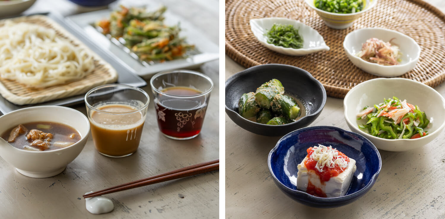 食卓を大きく自由に使うのはもちろん、定食のしつらえもまた、そのにぎやかさにわくわくします。夏の香味や小さなおかずを、好きな器を選んで盛りつけて、ちょっとずつをいろいろ楽しみましょう。