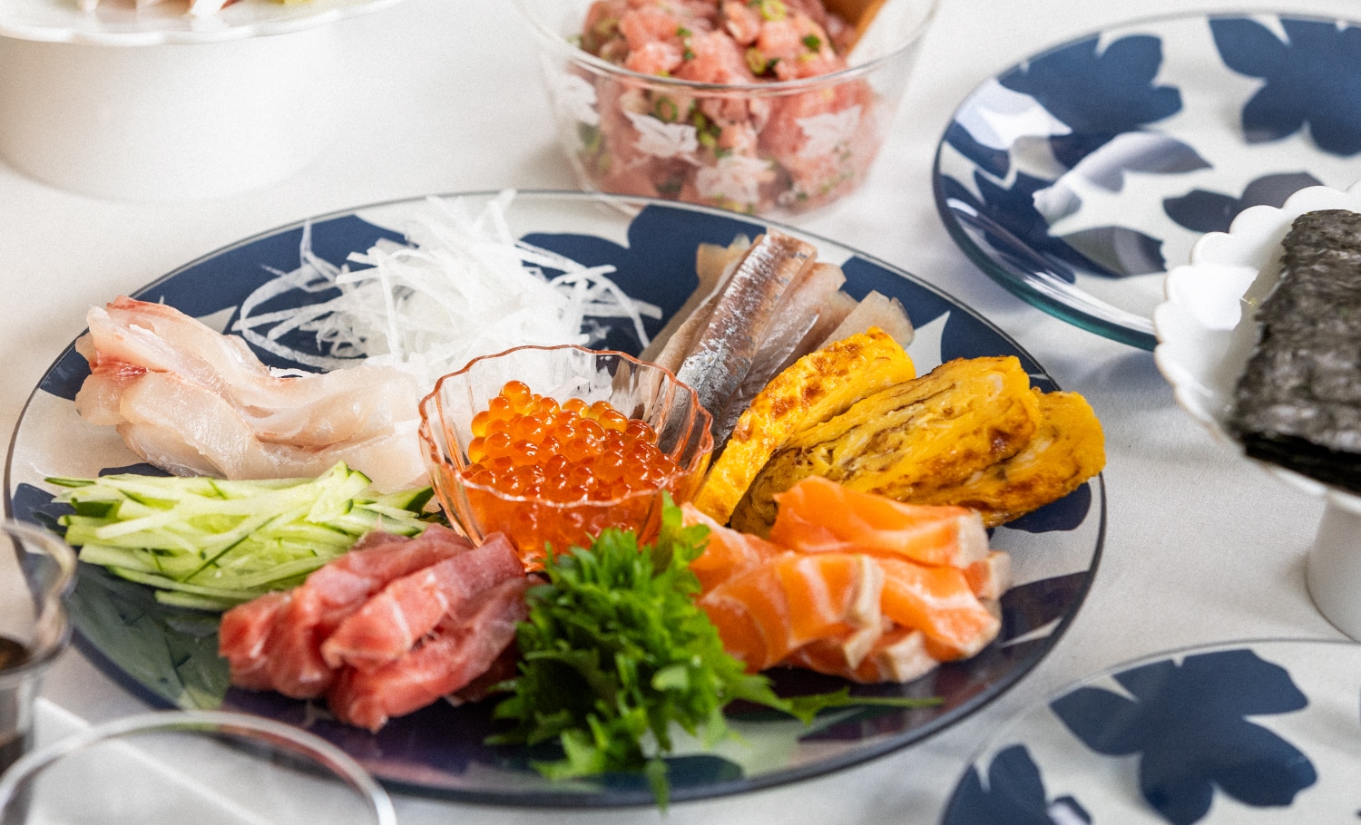 刺身やいくら、ねぎとろ、大葉など、定番はもちろん、家族それぞれが好きな具材を盛り込んで、わが家ならではのラインナップて器を彩りましょう。ガラスの大皿に丁寧に盛りつけたら、見た目も涼やかに、食欲もそそられます。