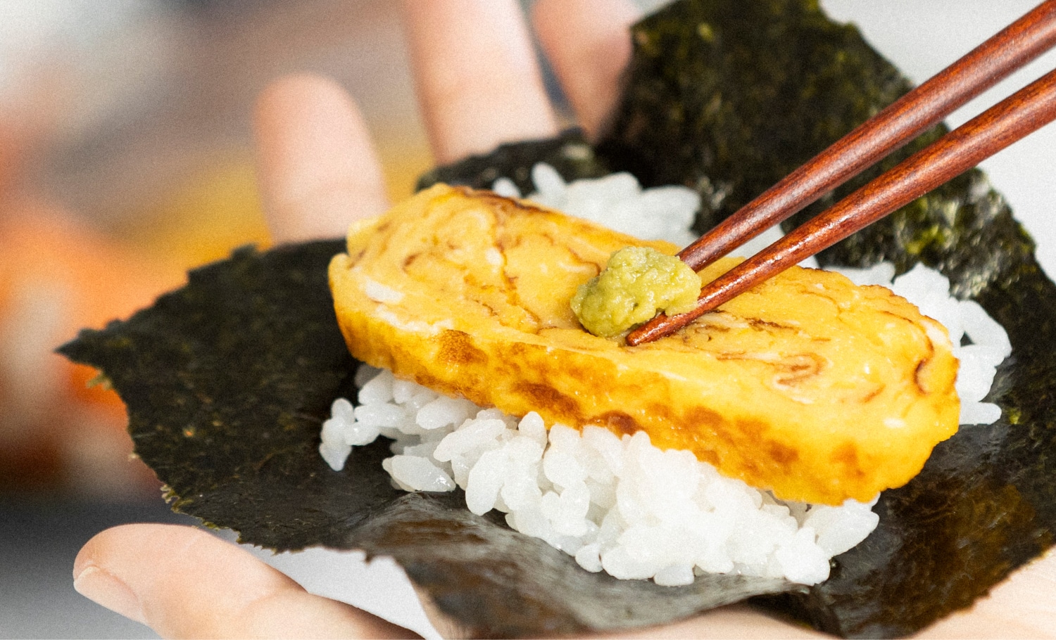 手巻きの定番、卵焼きは、いつもよりも少し甘めに焼くのがおすすめです。わさびをそえて、ぴりっとさせると、口の中で味のコントラストが楽しめます。