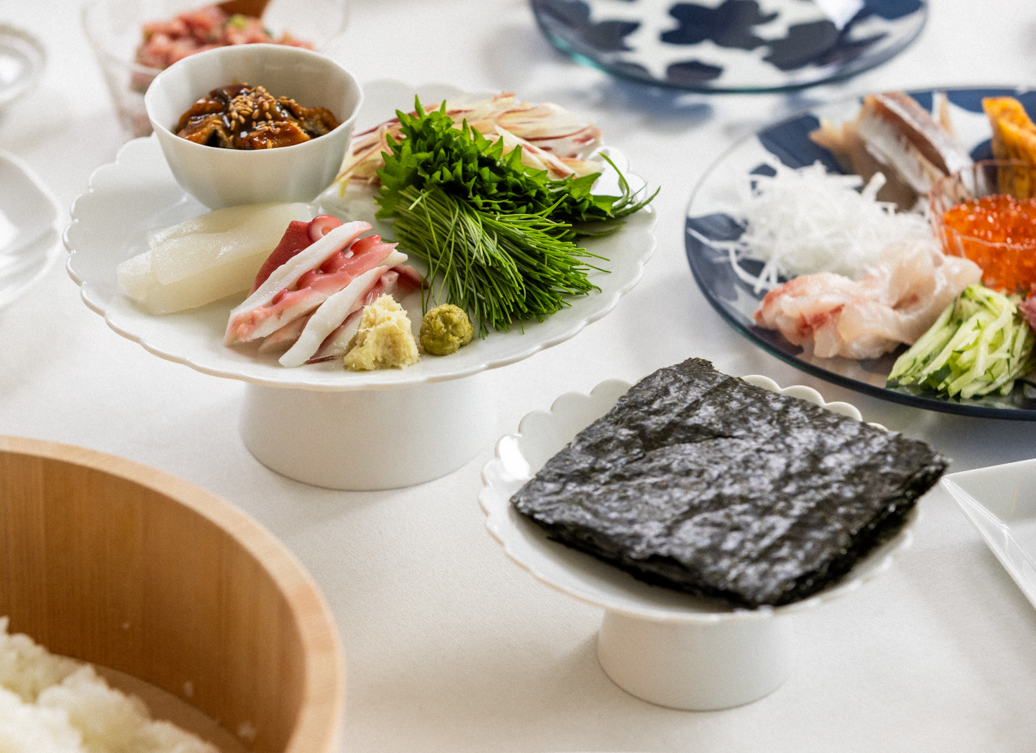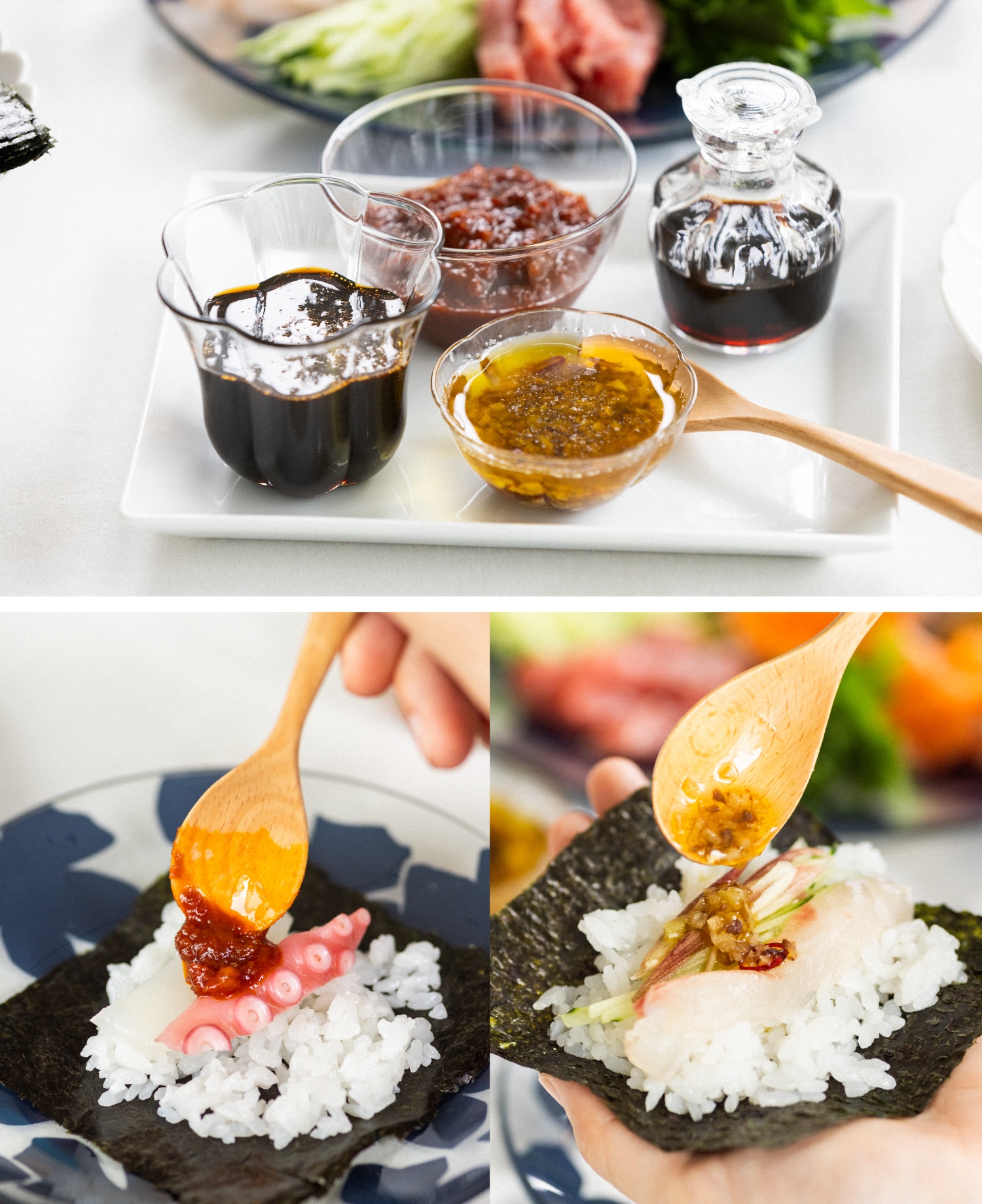 好きな具材を自分で選んでのせる手巻き寿司には、たれもいくつか用意して、味のバリエーションを楽しめる演出を。