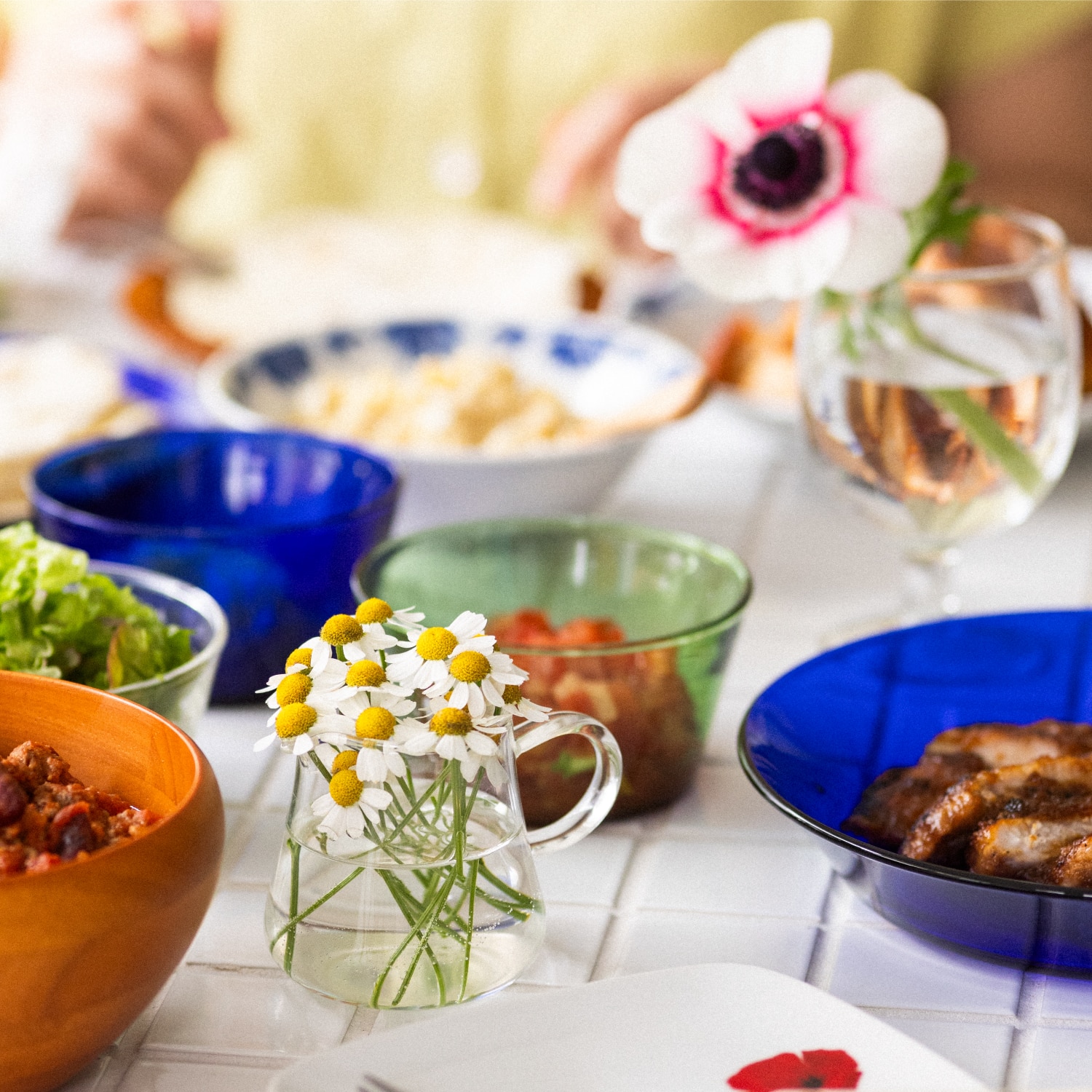 季節の花をさりげなく飾ると、彩り豊かな食材と相まって、食卓が一気におもてなしの空間に。特別感を添えるちょっとした工夫です。