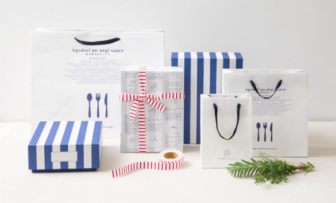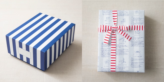 ギフトラッピングは、収納ボックスとしてもお使いいただける、ボーダー柄のギフトボックスに、栗原はるみのレシピとイラストがプリントされた、オリジナルの包装紙でお包みしてお届けします。