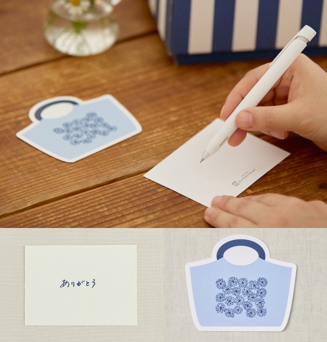 カードは、お好みで選べる2種。栗原はるみが書いた「ありがとう」の文字をプリントしたカード型と、人気アイテムの刺繍バッグ型をご用意しました。裏面には余白があるので、直接プレゼントをお渡しする方は、手書きのメッセージも入れていただけます。