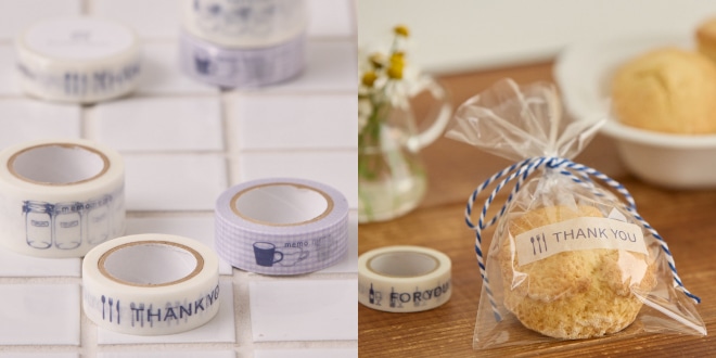 ゆとりの空間では、贈りものの準備が楽しくなる「オリジナルマスキングテープ」も展開しています。マスキングテープに手書きのメッセージを添えて、ラッピングをしてみませんか。ちょっとしたひと手間が、感謝の気持ちをより温かく伝えてくれます。また、ラッピングだけでなく、保存びんのラベル代わりとしてなど、様々なシーンに活躍するアイテムです。