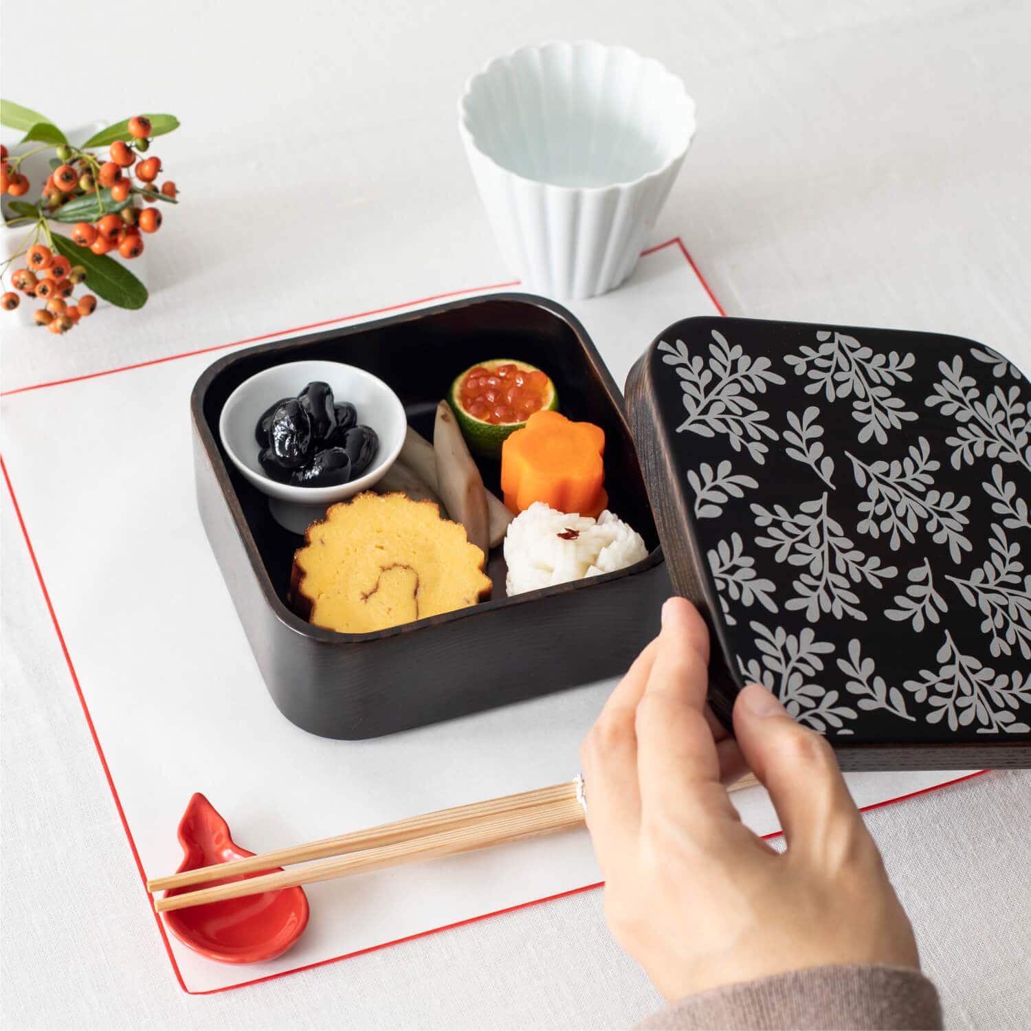 リーフ柄の小ぶりなお重には、ひとり分のおせちの盛りつけに。蓋付の重箱を開ける瞬間は、何が入っているのかなとワクワクするひと時です。深さのある小さな杯は、小さな重箱に収まりやすく、汁気のあるおせちの盛りつけの器としても便利です。
