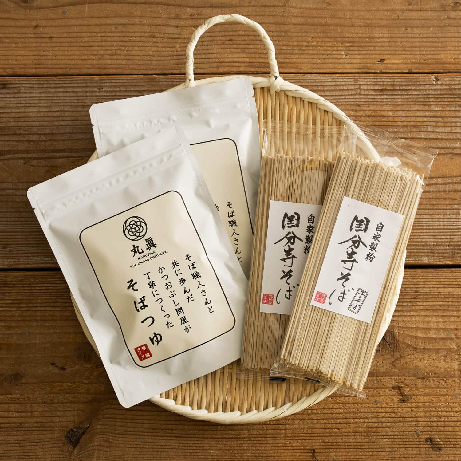 【WEB限定セット】丸眞さんのそばつゆと国分寺そばさんの乾麺二八そばとふきんのセット5,430円(税込)