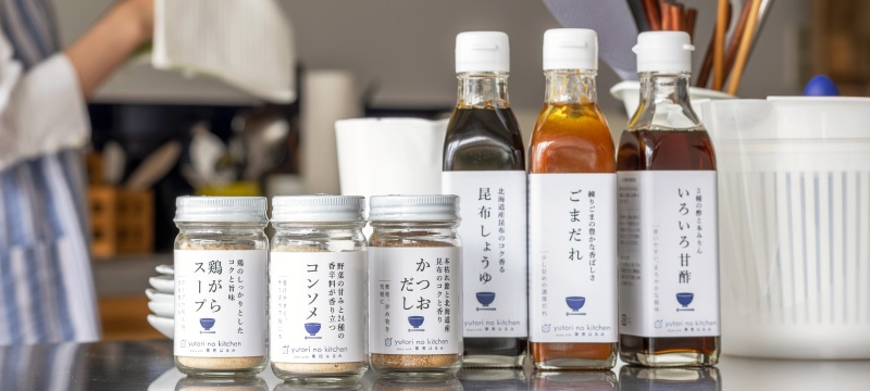 「ゆとりのキッチン」は、料理家 栗原はるみプロデュースのオリジナル食品ブランド。毎日の料理をもっとおいしく、もっと楽しめるように、という想いを込めて作りました。定番人気の調味料を中心に、素材の味わいを大切にしたジャム、ティータイムはもちろん、ふだんの食事にも合うお茶を展開しています。