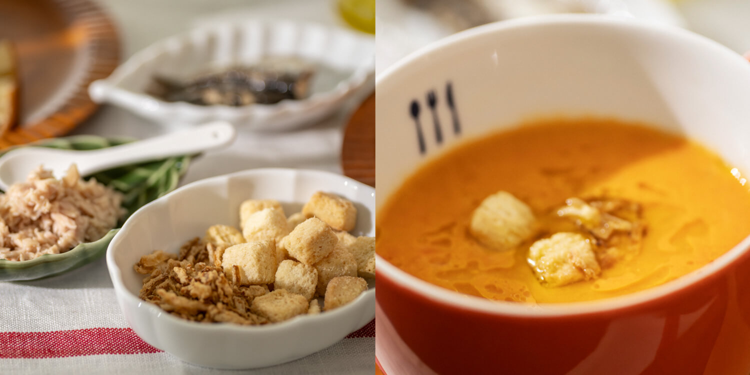 シンプルにオリーブオイルをかけていただくと、まろやかにおいしくなりますが、クルトンやフライドオニオン、ツナ、オイルサーディンなど、自分好みのトッピングを重ねて、食感や味わいの変化を楽しむのもおすすめです。パンを何種類か用意して、浸しながら食べるのも楽しみ方。その日の気分で楽しみましょう。