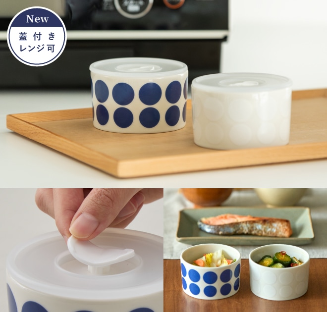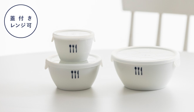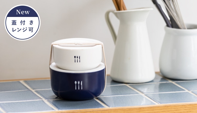 磁器製のレンジパック。ころんと丸いフォルムで、小鉢として食卓に並べても自然となじみます。保存容器としてだけでなく、食器としても使えるから、洗いものが少なく済むのもうれしいポイント。使わないときは入れ子にして、場所を取らずすっきりと収納できます。