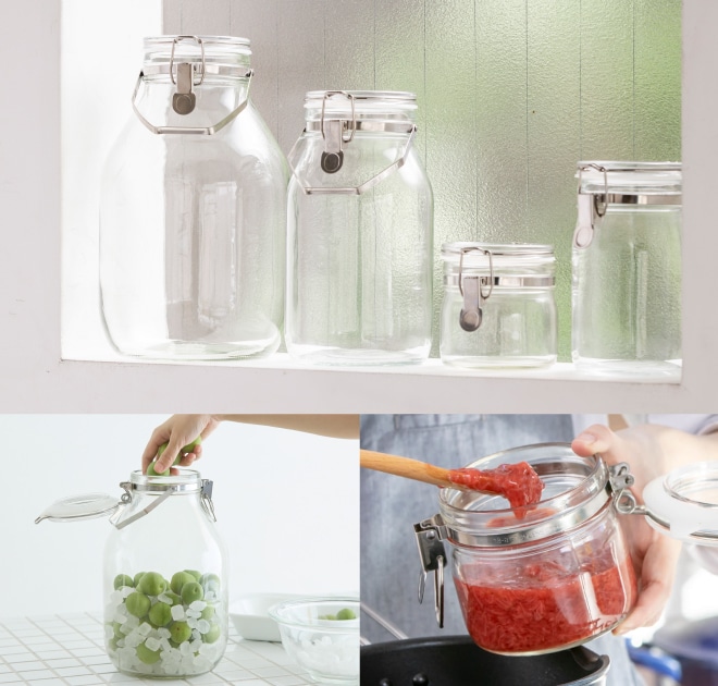 密閉性が高く、ピクルスやジャムなどの液状のものから、湿気を避けたい乾物まで幅広く保存できます。手作りの果実酒など、季節の手仕事にもおすすめ。口が広い構造で、中身の出し入れやお手入れもスムーズです。金具はすべてステンレス製で、丈夫でサビにくく、長期保存にも安心してお使いいただけます。