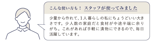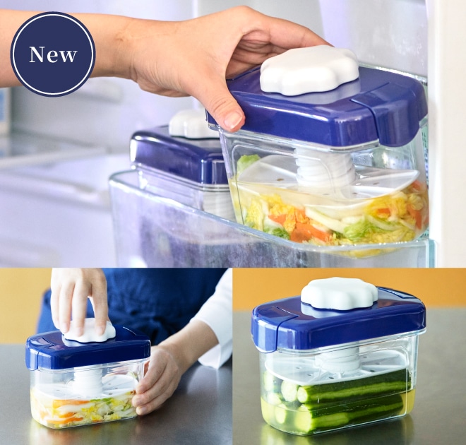 冷蔵庫のドアポケットにすっきり収まる、コンパクトな浅漬けメーカー。場所を取らずに、おうちで簡単に手作りの漬けものが楽しめます。本体が透明だから、漬かり具合がひと目でチェックできます。手軽に「あともう1品」が作れる、便利な道具です。
