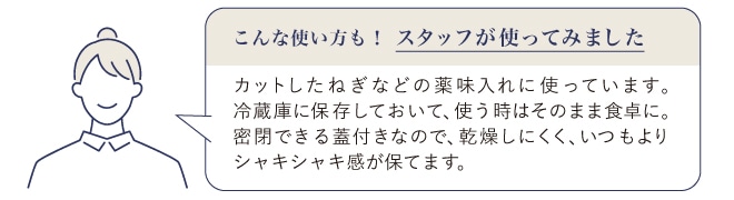 密閉できる蓋付きの保存容器。汁漏れやにおい移りをしっかり防いでくれるのが特長です。おかずの保存はもちろん、そのまま食卓に並べて器としてもお使いいただけます。冷蔵庫の空いたスペースにすっきり収まるサイズ感もうれしいです。