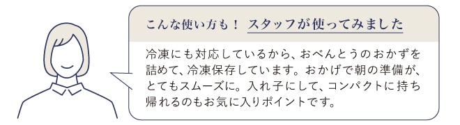 おべんとうから常備菜の保存まで、幅広く活躍するセット。しっかり閉まる密閉蓋で、汁漏れも気にならず安心です。大きい方におかず、小さい方にごはんを詰めたり、大きい方におかずとごはん、小さい方にフルーツを入れたり。その日のメニューや食べたい量に合わせて、使い分けるのもおすすめです。