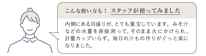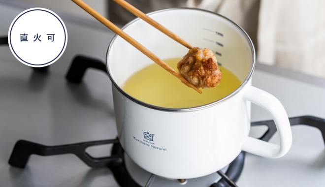 直火にかけられるので、常備菜や余った食材を保存しておき、そのまま温め直しができます。また、野菜をゆでる小鍋や、少量の揚げもの鍋として使えて、そのままオイルポットにもなる優れもの。持ち手付きで、冷蔵庫から片手でさっと取り出せるうれしい工夫も。