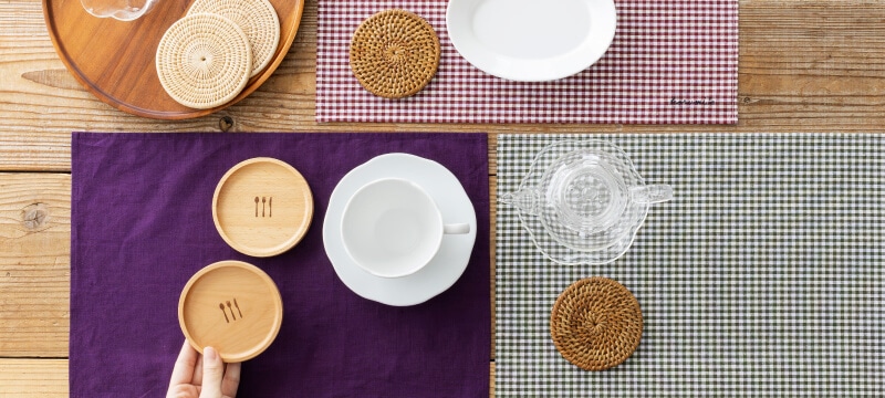 テーブルコーディネートが楽しくなる、コースターやマット。色や素材などで、季節に合わせた雰囲気を演出するのもおすすめです。食卓がぱっと華やかになるから、ティータイムの会話も一段と弾みそう。手軽に気分転換できるのもうれしいです。