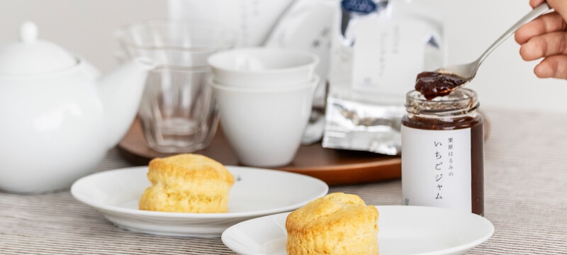 ゆとりの空間オリジナルのお茶とジャム。お茶は、ほっと落ち着く香りで、お菓子のおいしさを引き立ててくれます。ジャムはスコーンに添えたり、飲みものに加えたりと楽しみ方もいろいろ。自分へのご褒美にはもちろん、ちょっとしたギフトにもおすすめです。
