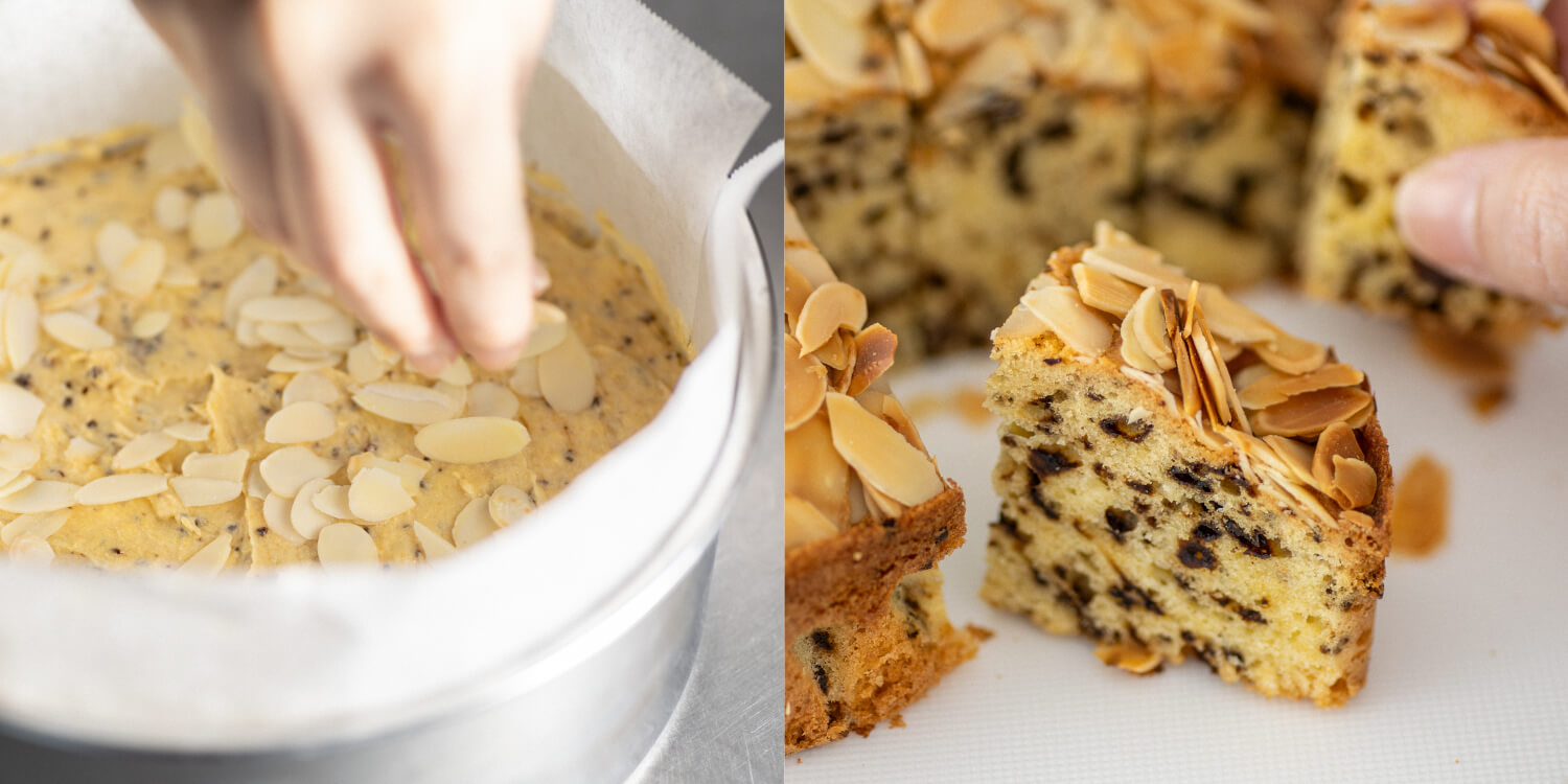 アーモンドコーヒーケーキは、アーモンドの食感と香ばしさ、アクセントになるコーヒーやラムレーズンの味が口の中に広がって、コーヒーのほろ苦さともよくマッチします。