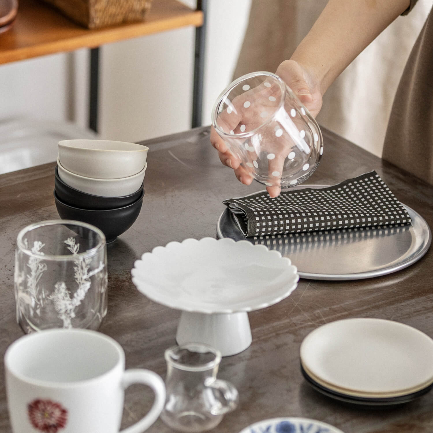 その日の気分に合わせてするテーブル作りも、お茶の時間の楽しさ。 お気に入りの茶器を取り出したり、添えるお菓子の器を選ぶのはもちろん、やわらかな風合いのリネンを一枚敷くだけでも、その時間を包む空気はがらっと変わります。