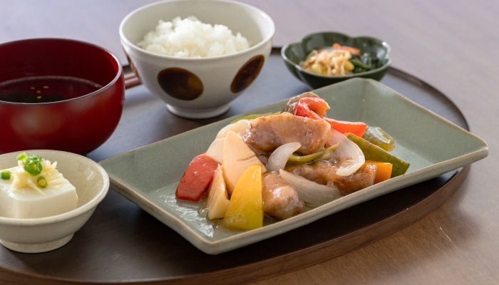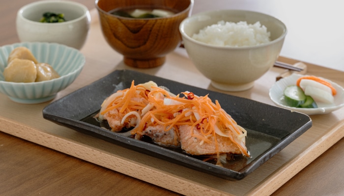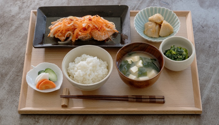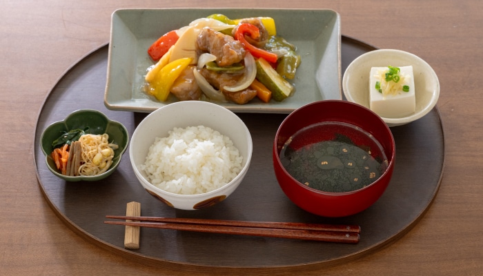 定食は、主菜1つに副菜2つ、ごはん、汁ものというのが基本の形です。ひとり分ずつ分かれているから、お盆やランチョンマットを取り入れて、それぞれの定食スタイルを作ってみるのも楽しみ方のひとつ。器をひとつ変えるだけでも、食卓の印象はぐっと変わります。