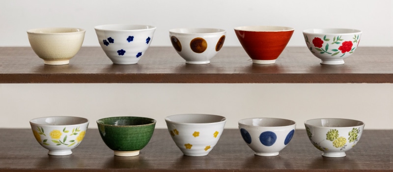 味わいのある手描きのドット柄や、食卓をぱっと華やかにする花柄など、デザインの種類が豊富なゆとりの空間の飯碗。形や風合いにもそれぞれ個性があり、食卓を彩るさまざまな種類が揃っています。一つひとつの表情が豊かで、毎日の器選びの楽しみも広がりますよ。