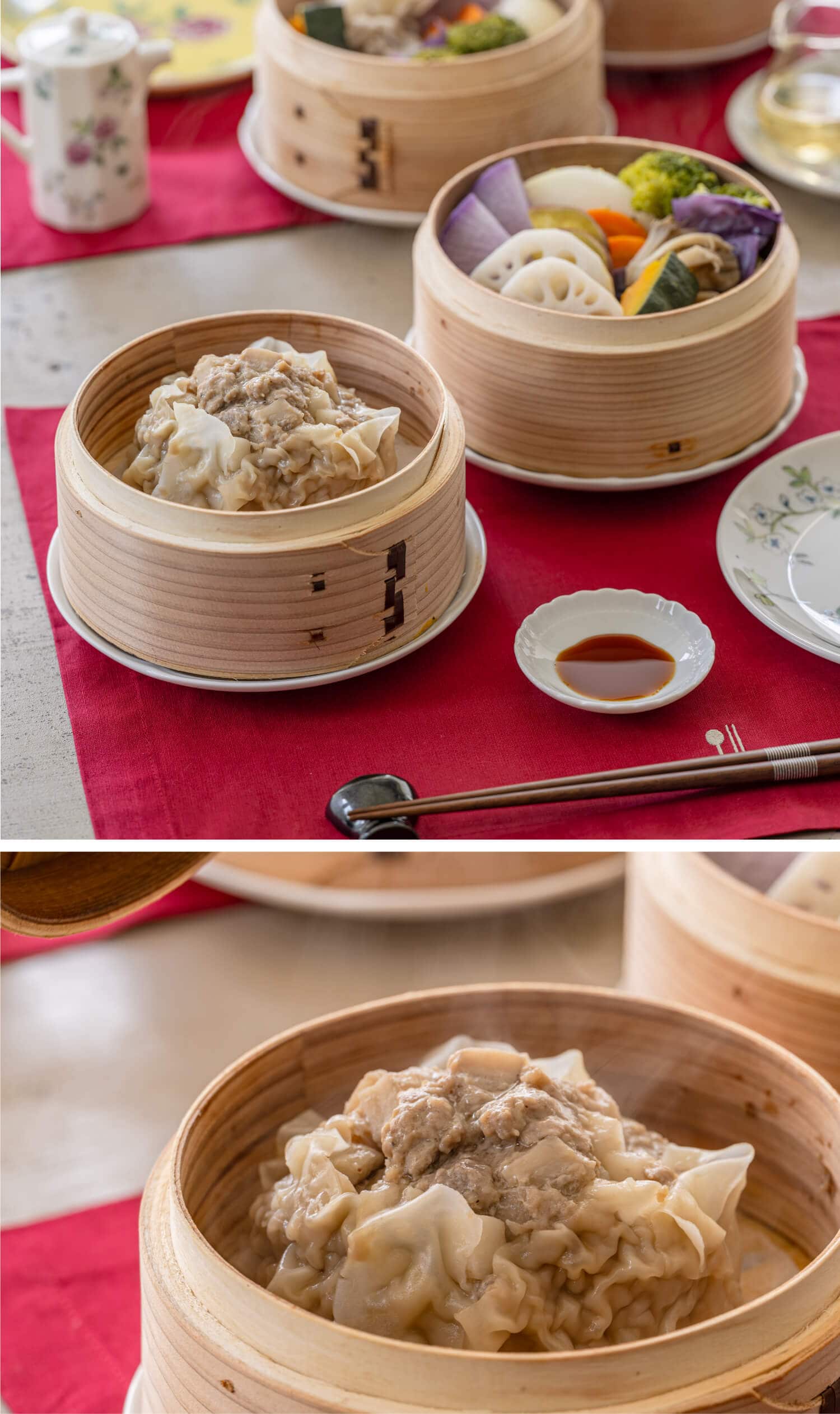 シューマイは、たねを作ったら包んで蒸すだけの、実はとても手軽な料理。せいろで蒸し上げると、具がふっくらと、皮はつややかに仕上がります。蒸し立てのシューマイは、肉汁たっぷり。せいろのふたを開けた途端、天然のスギのそれとともにふんわり香って、思い切り食欲をそそります。立ち込める湯気とともに、食卓があたたかくわくごちそうです。