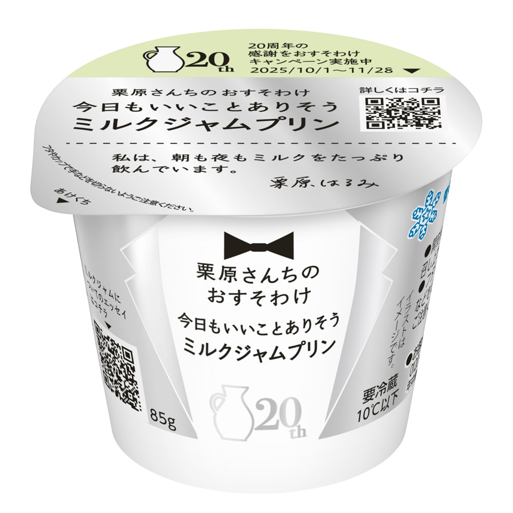 新商品『栗原さんちのおすそわけ 今日もいいことありそうミルクジャムプリン』は、ミルクのおいしさにこだわり、栗原はるみが普段からよく作っている「ミルクジャム」の味わいをプリンにしました。なめらかなくちどけで、口の中に広がるミルクの深い味わいをお楽しみください。