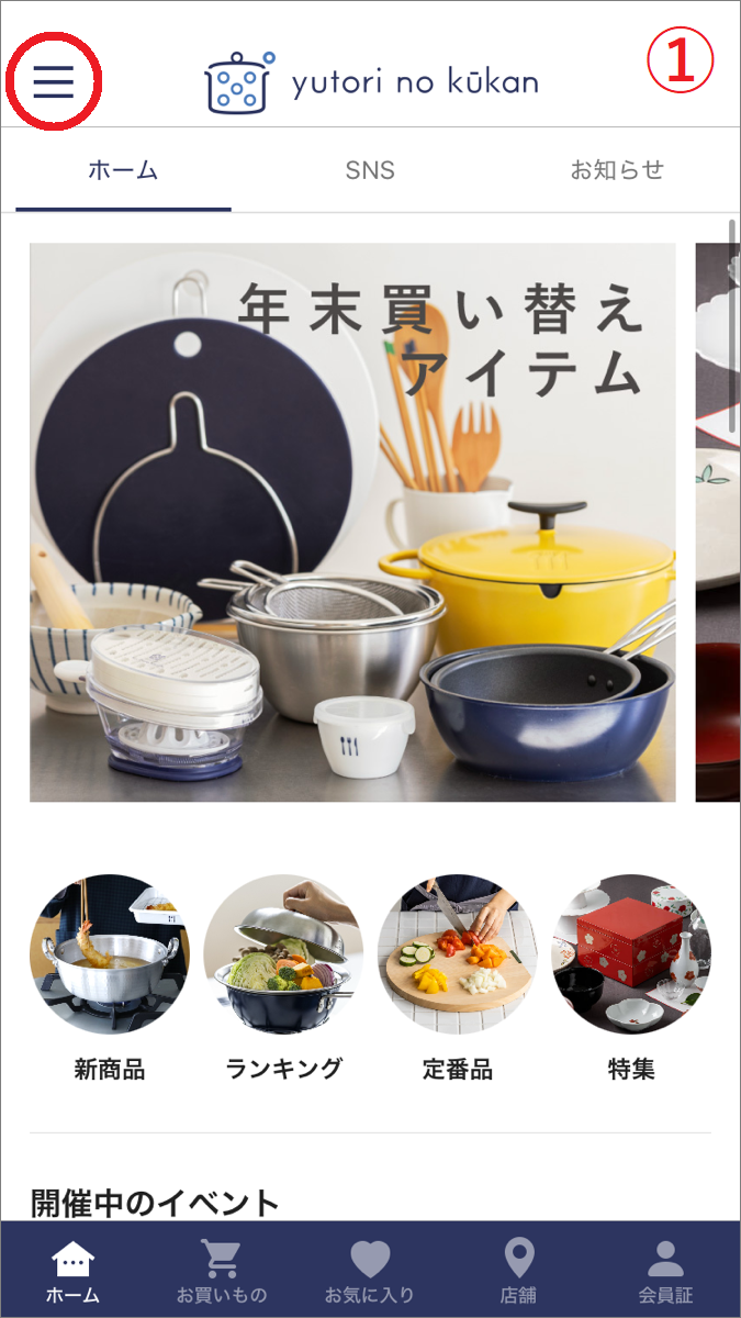 ①アプリのホーム画面を開き、左上の三本線(メニュー)をタップします。