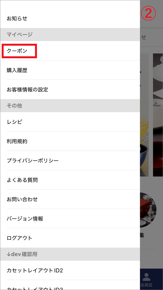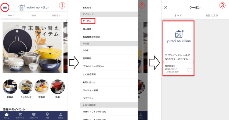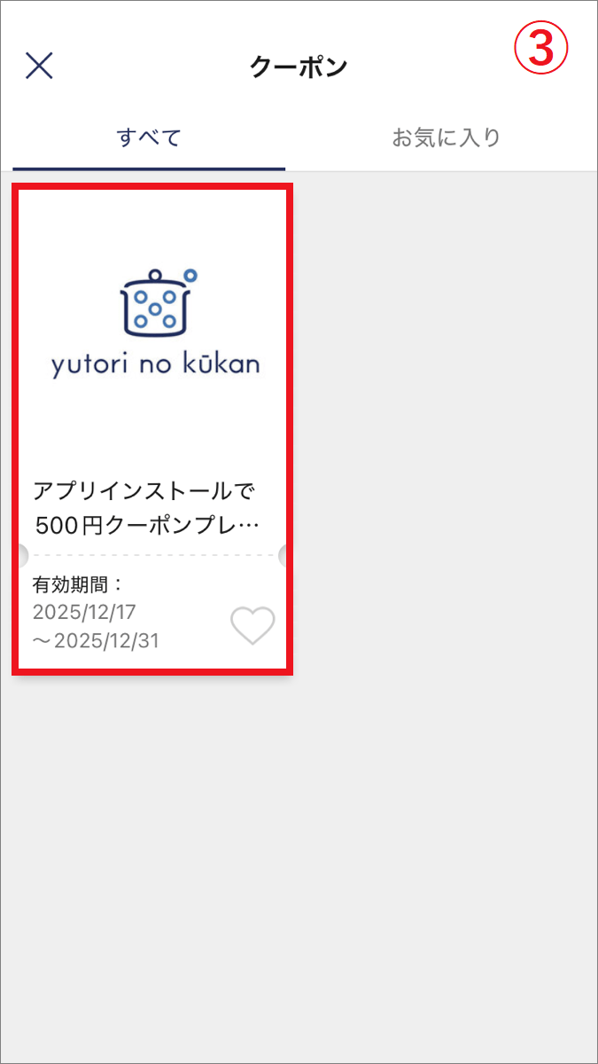 ③クーポンが表示される為、使用するクーポンをタップします。クーポンに記載の使用方法に沿って、クーポンをお使いください。