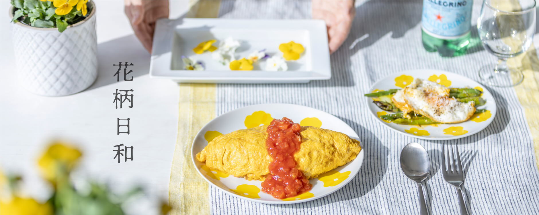 白ベースで表現された花びらは、ぱっと料理を引き立てながら、さりげないアクセントをもたらします。そのちょうどよいさりげなさが使いやすくて気軽です。